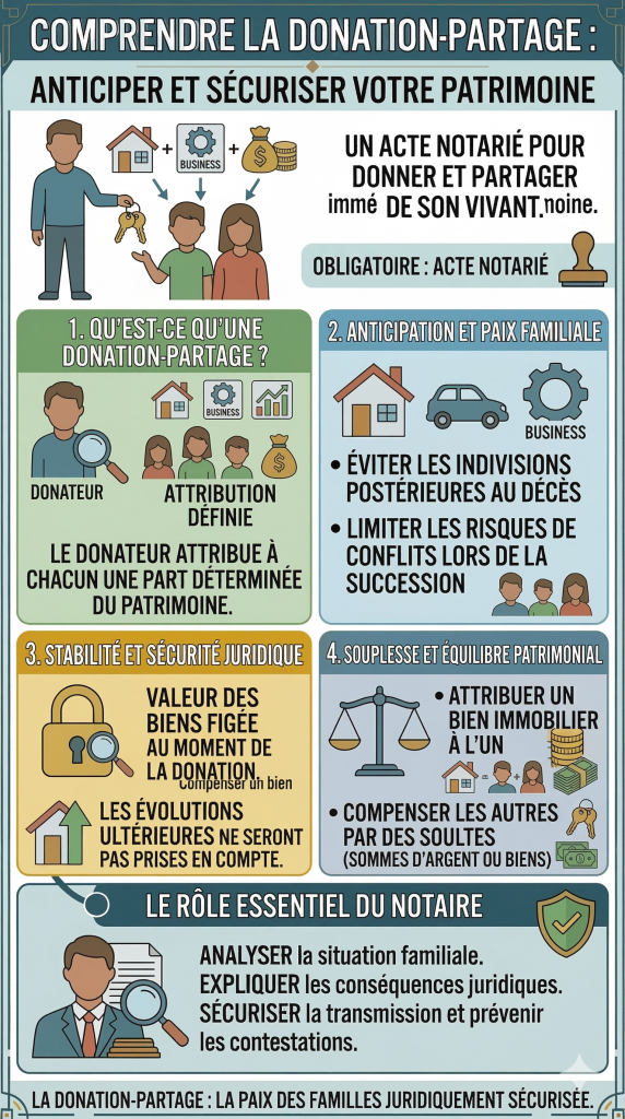 La donation-partage est un acte par lequel une personne transmet de son vivant une partie de ses biens à ses héritiers tout en procédant à leur répartition.
