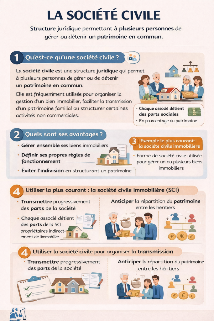La société civile est une structure juridique qui permet à plusieurs personnes de gérer ou de détenir un patrimoine en commun. Elle est fréquemment utilisée pour organiser la gestion d’un bien immobilier, faciliter la transmission d’un patrimoine familial ou structurer certaines activités non commerciales.